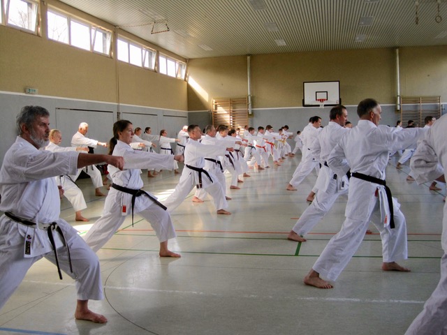 Der verfügbare Trainingsplatz reichte auf jeden Fall aus, um unter Wahrung von Mindestabständen die Vorgaben der Übungsleiter zur Verbesserung der Karate-Grundschule nachzuvollziehen. Den Teilnehmern wurden interessante Anregungen geboten, zur Abwechslung die Karate-Routine zu verlassen und elementare Techniken durch unkonventionelle Veränderung von Dynamik, schnellen Wendungen und Kime (Brennpunkt der eingesetzten Arm- oder Beintechnik) neu zu denken und variabel umzusetzen. Anfänger und Fortgeschrittene konnten ihr eigenes Karate daran messen und ihre Möglichkeiten verbessern.