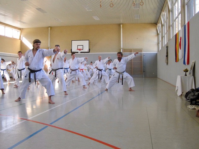 Der verfügbare Trainingsplatz reichte auf jeden Fall aus, um unter Wahrung von Mindestabständen die Vorgaben der Übungsleiter zur Verbesserung der Karate-Grundschule nachzuvollziehen. Den Teilnehmern wurden interessante Anregungen geboten, zur Abwechslung die Karate-Routine zu verlassen und elementare Techniken durch unkonventionelle Veränderung von Dynamik, schnellen Wendungen und Kime (Brennpunkt der eingesetzten Arm- oder Beintechnik) neu zu denken und variabel umzusetzen. Anfänger und Fortgeschrittene konnten ihr eigenes Karate daran messen und ihre Möglichkeiten verbessern.