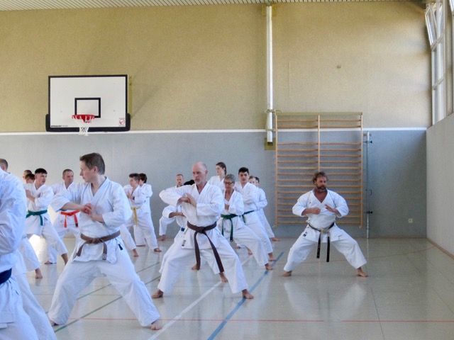 Der verfügbare Trainingsplatz reichte auf jeden Fall aus, um unter Wahrung von Mindestabständen die Vorgaben der Übungsleiter zur Verbesserung der Karate-Grundschule nachzuvollziehen. Den Teilnehmern wurden interessante Anregungen geboten, zur Abwechslung die Karate-Routine zu verlassen und elementare Techniken durch unkonventionelle Veränderung von Dynamik, schnellen Wendungen und Kime (Brennpunkt der eingesetzten Arm- oder Beintechnik) neu zu denken und variabel umzusetzen. Anfänger und Fortgeschrittene konnten ihr eigenes Karate daran messen und ihre Möglichkeiten verbessern.